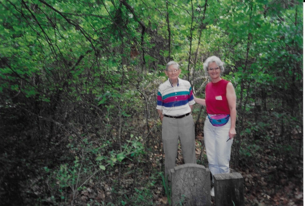 On a research trip to Jones County again in July 1994, Vikki and I met Earle Knight, who took us to the home of Jerry Jones to get the key to the gated fence on the property where Newt and Rachel are buried. Earle, age 89 at the time, strained his eyes as I carefully steered our new Ford Taurus down a rather primitive dirt road with a somewhat steep descent into the bottomlands in search of their graves. As I maneuvered the car to straddle washed-out gullies to the bottom, and as I later plowed through fields of thick weeds that came up over the hood of the car, I began to have second thoughts about just what in the hell we were doing. I mean, there we were, down in an isolated swamp, dependent on the memory of an eighty-nine-year-old man who didn’t remember how many years it had been since he last visited the cemetery. From time to time along the way, we spotted a tree limb with a small piece of fabric tied to it as a marker, but the markers were no longer easy to follow due to changes in vegetation and overgrown brush. Earle seemed confused at times about which way to go. The distant rumble of thunder added tension and lent a bit of urgency to our search for the graves.