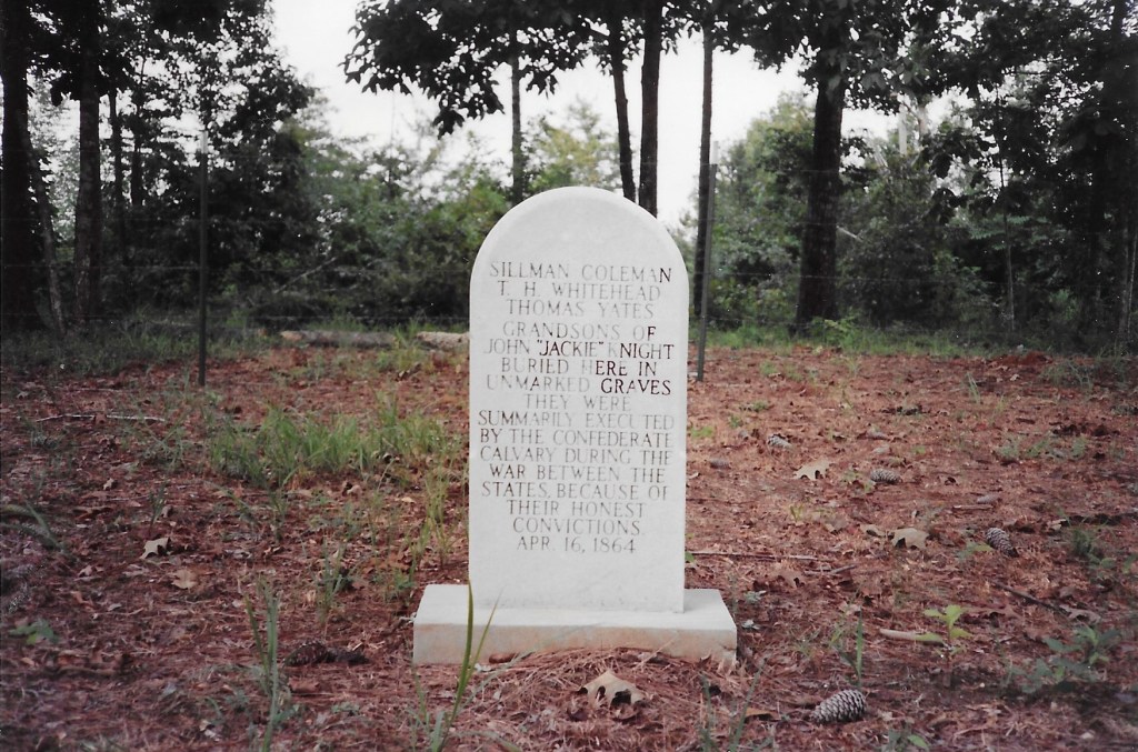 The next thing I knew, we were bouncing along in a truck with Julius Huff, who took us to the Jackie Knight cemetery where several members of Captain Newt Knight’s band of Unionists were buried in the Leaf River swamp after Confederate forces hanged them. I got my first good feel of Jones County history, folklore, and culture when he pulled out a key to unlock the old gate guarding the bumpy road down into the swamp. I recall vividly how chills ran up and down my spine when I read the tombstone inscription, “They were summarily executed by the Confederate Cavalry During the War Between the States for their honest convictions, April 14, 1864.” It felt like we had entered a hallowed space. Looking back, I think it was the starting point for my song, “Jones County Jubilee,” even though I didn’t write it till a decade later.